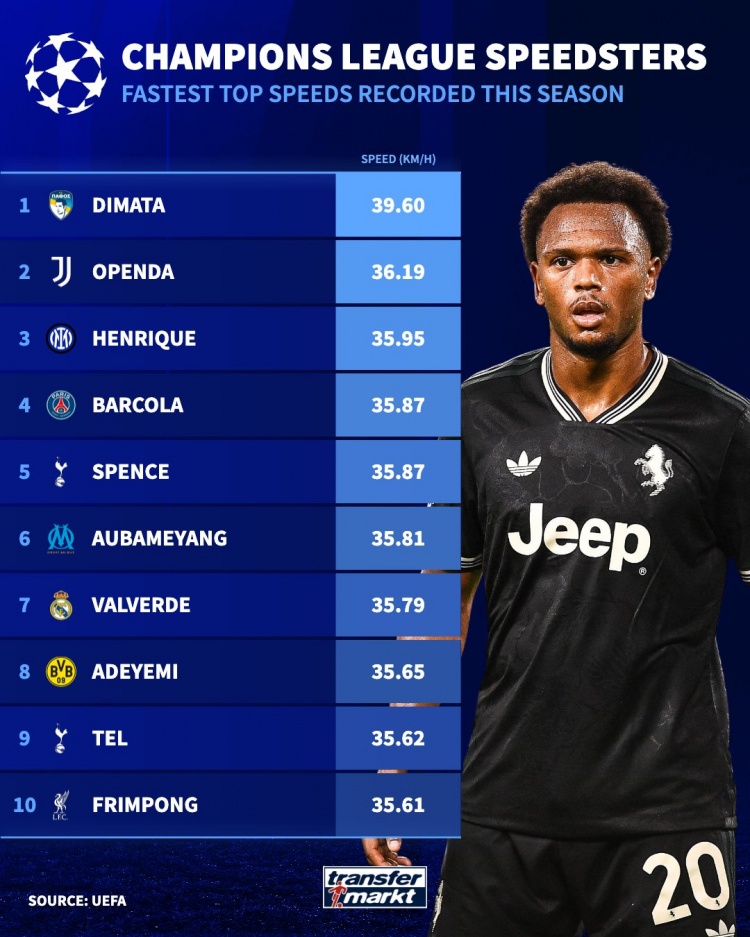 1月22日讯 德国转会市场盘点了本赛季欧冠赛场上最快速度球员,帕福斯的迪马塔以39.6KM/H居首,尤文的奥蓬达和国米的恩里克位居二三位。